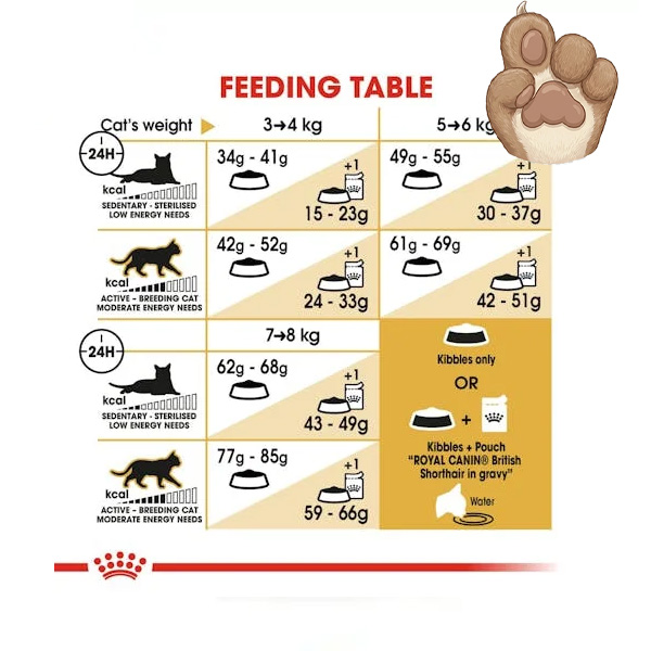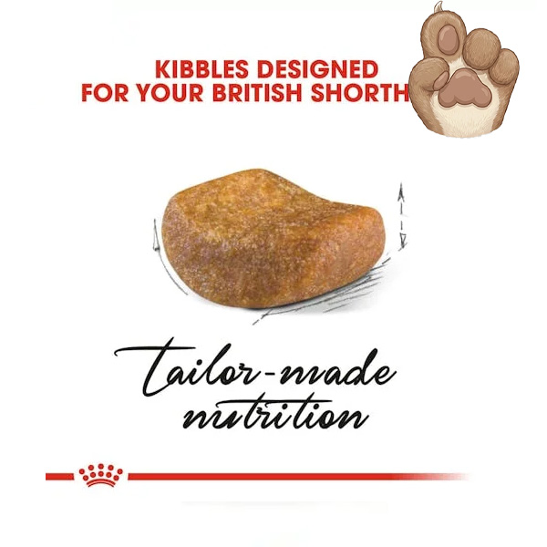 غذای خشک Royal Canin British Shorthair بهطور ویژه برای گربههای مو کوتاه بریتانیایی طراحی شده و ترکیبات آن مطابق نیازهای این نژاد تنظیم شده است. شکل و فرم دانههای غذا نیز به گونهای است که گربه با فک پهن بریتانیایی بتواند به راحتی آن را بجود و مصرف کند.